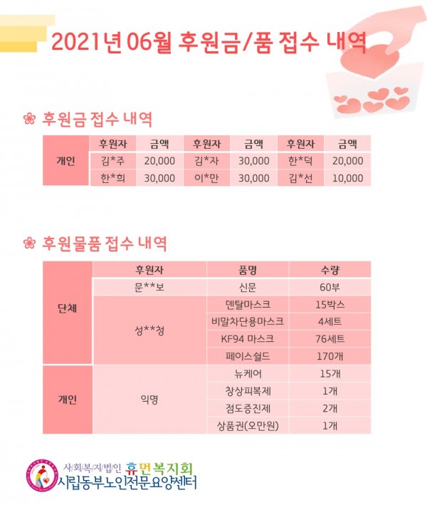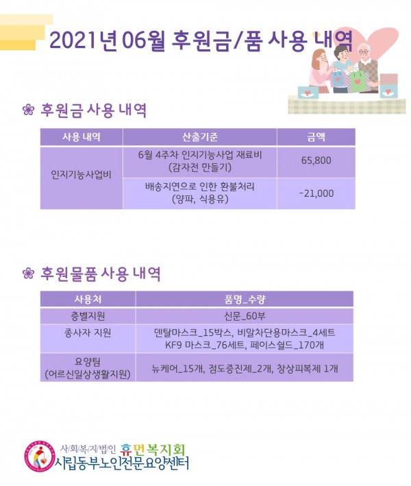 2021년 6월 후원금/품 접수내역, 사용내역 페이지 정보 작성자 최고관리자 작성일2021-07-12 11:12 조회12,332회 댓글0건 관련링크 이전글 다음글 목록 본문 무더운 여름이 시작되었습니다. 더위 속에서 모두 힘내시고 6월 한달 동안 많은 관심과 사랑의 손길을 베풀어 주셔서 감사합니다.7월에도 많은 관심과 사랑을 부탁 드립니다. :) 댓글목록 등록된 댓글이 없습니다. 이전글 다음글 목록