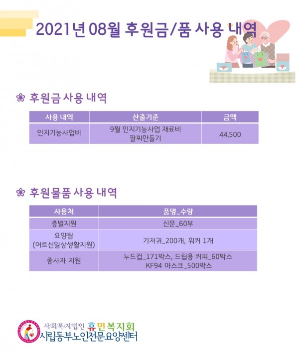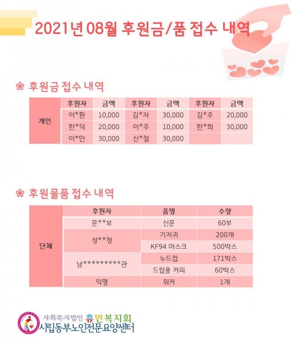 2021년 8월 후원금/품 접수내역, 사용내역 페이지 정보 작성자 최고관리자 작성일2021-09-06 10:35 조회12,009회 댓글0건 관련링크 이전글 다음글 목록 본문 무더웠던 여름 8월에 우리 기관에 많은 관심과 사랑을 베풀어주셔서 감사드립니다.9월에도 많은 사랑 부탁드립니다:) 댓글목록 등록된 댓글이 없습니다. 이전글 다음글 목록