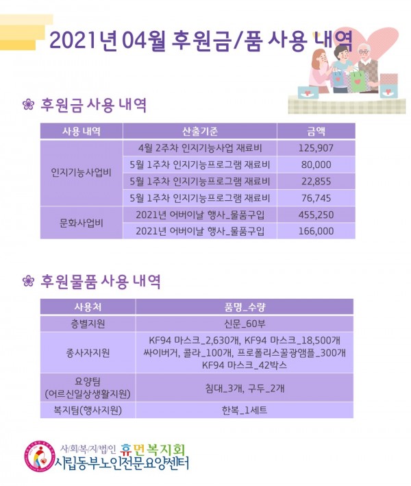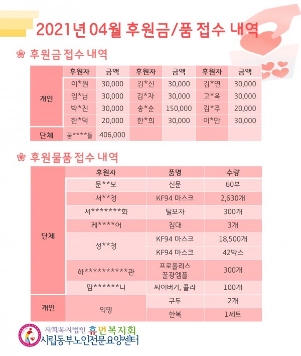 2021년 4월 후원금/품 접수내역, 사용내역 페이지 정보 작성자 최고관리자 작성일2021-05-07 18:23 조회12,489회 댓글0건 관련링크 이전글 다음글 목록 본문 4월 시립동부노인전문요양센터에 후원해주신 모든 분들께 많은 감사의 인사를 전해드립니다.일교차로 인해 모두 감기 조심하시고, 5월에도 많은 관심과 사랑 부탁드립니다:) 댓글목록 등록된 댓글이 없습니다. 이전글 다음글 목록