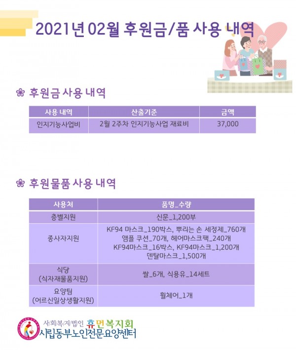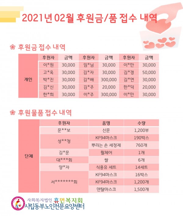 2021년 2월 후원금/품 접수내역, 사용내역 페이지 정보 작성자 최고관리자 작성일2021-03-05 07:52 조회12,780회 댓글0건 관련링크 이전글 다음글 목록 본문 2월 시립동부노인전문요양센터에 후원해주신 모든 분들께 많은 감사의 인사를 전해드립니다.다가오는 봄, 3월의 온기와 함께 센터를 위해 늘 관심과 사랑 부탁드리겠습니다. 감사합니다:) 댓글목록 등록된 댓글이 없습니다. 이전글 다음글 목록