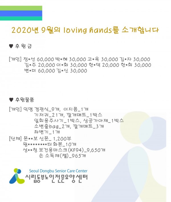 2020년 9월 loving hands!!를 소개합니다. 페이지 정보 작성자 최고관리자 작성일2020-10-06 11:49 조회12,892회 댓글0건 관련링크 이전글 다음글 목록 본문 성큼 다가온 계절, 가을이 돌아왔습니다.모두 추석 한가위 잘 보내셨는지요? 항상 행복한 일 가득하시고10월에도 많은 관심과 사랑의 손길을 베풀어주세요!^^ 감사합니다:) 댓글목록 등록된 댓글이 없습니다. 이전글 다음글 목록
