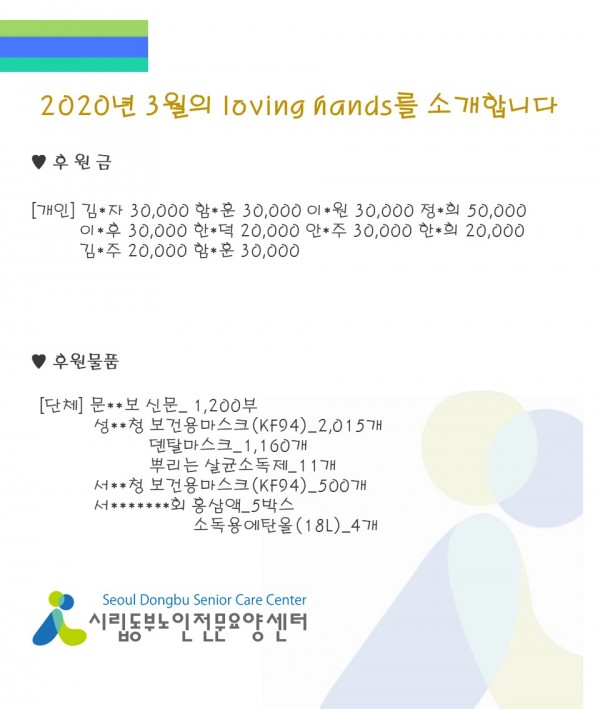 2020년 3월 loving hands!!를 소개합니다. 페이지 정보 작성자 최고관리자 작성일2020-04-06 08:05 조회13,374회 댓글0건 관련링크 이전글 다음글 목록 본문 3월 시립동부노인전문요양센터에 후원해주신 모든 분들께 많은 감사의 인사를 전해드립니다.만개한 벚꽃처럼 아름다운 날들 보내시고, 4월에도 많은 관심과 사랑 부탁드립니다. 댓글목록 등록된 댓글이 없습니다. 이전글 다음글 목록