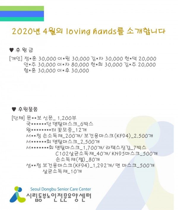 2020년 4월 loving hands!!를 소개합니다. 페이지 정보 작성자 최고관리자 작성일2020-05-06 18:35 조회13,126회 댓글0건 관련링크 이전글 다음글 목록 본문 4월 시립동부노인전문요양센터에 후원해주신 모든 분들께 많은 감사의 인사를 전해드립니다.성큼 무더운 여름의 날씨가 다가오고 있습니다. 일교차로 인해 감기 조심하시고 5월에도 많은 관심과 사랑 부탁드립니다. 댓글목록 등록된 댓글이 없습니다. 이전글 다음글 목록