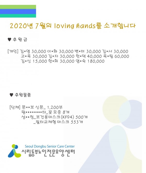 2020년 7월 loving hands!!를 소개합니다. 페이지 정보 작성자 최고관리자 작성일2020-08-05 09:12 조회13,162회 댓글0건 관련링크 이전글 다음글 목록 본문 본격적인 여름과 더불어 장마기간 많은 양의 비로 인해 힘든 하루하루 보내고 계시지만 늘 우리 동부를 위해 많은 관심과 사랑을 주시는 여러분들께 감사의 말씀 전해드립니다.8월에도 동부에 많은 사랑 부탁드립니다. 감사합니다♥ 댓글목록 등록된 댓글이 없습니다. 이전글 다음글 목록