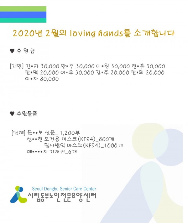 2월에 시립동부노인전문요양센터에 후원해주신 모든 분들께 많은 감사의 인사를 전해드립니다.