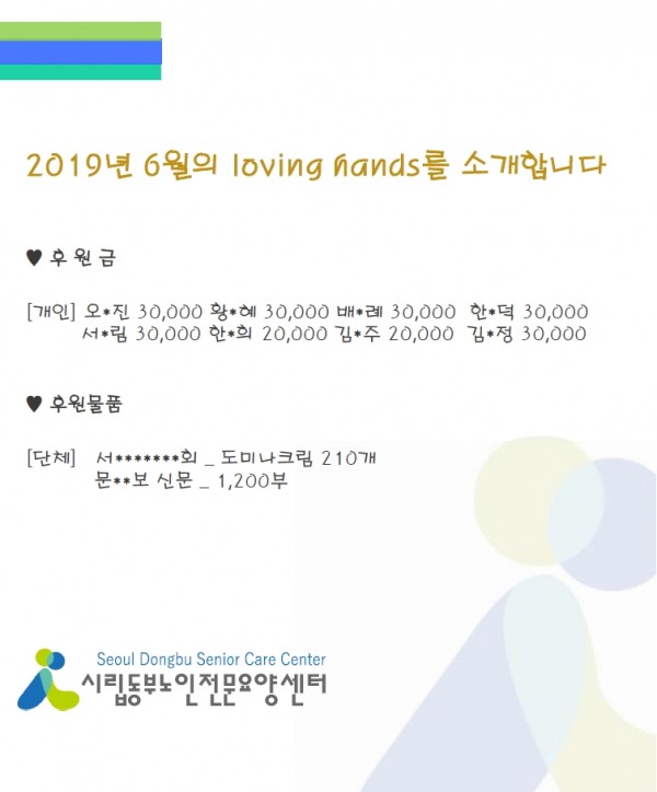 2019년 6월 loving hands!!를 소개합니다. 페이지 정보 작성자 최고관리자 작성일2019-07-10 10:54 조회14,016회 댓글0건 관련링크 이전글 다음글 목록 본문 성큼 찾아온, 때 이른 더위에 사랑의 손길을 내밀어주신 후원자님께 다시한번 감사의 말씀을 드립니다.7월에도 동부에게 많은 관심과 사랑 부탁 드립니다. 댓글목록 등록된 댓글이 없습니다. 이전글 다음글 목록