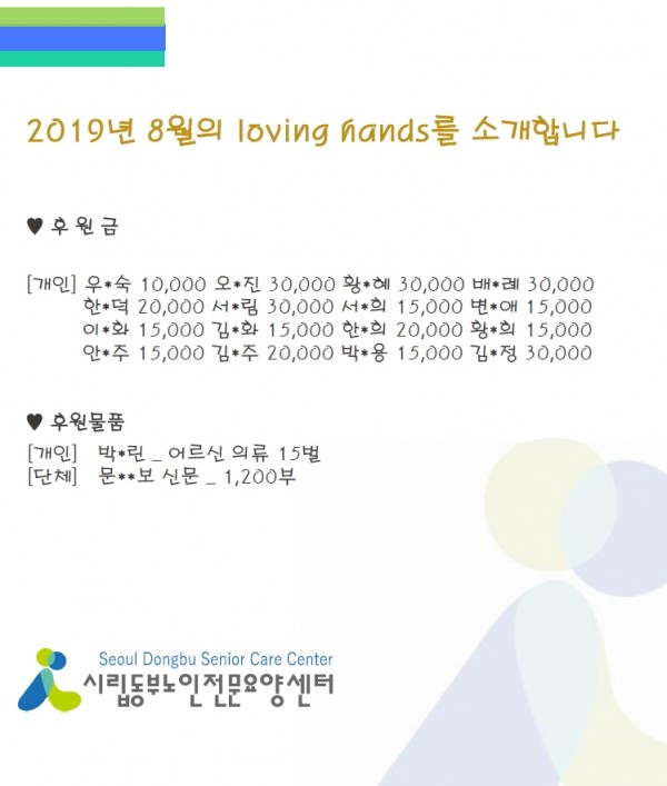 2019년 8월 loving hands!!를 소개합니다. 페이지 정보 작성자 최고관리자 작성일2019-09-05 16:43 조회13,909회 댓글0건 관련링크 이전글 다음글 목록 본문 뜨거운 여름, 8월에도 많은 관심과 사랑을 주셔서 감사합니다.이제는 제법 시원한 9월이 찾아 왔습니다. 9월에도 많은 관심과 사랑의 손길을 베풀어주세요!^^ 감사합니다. 댓글목록 등록된 댓글이 없습니다. 이전글 다음글 목록