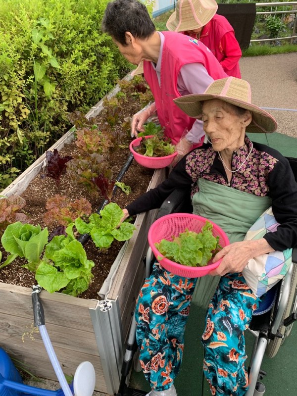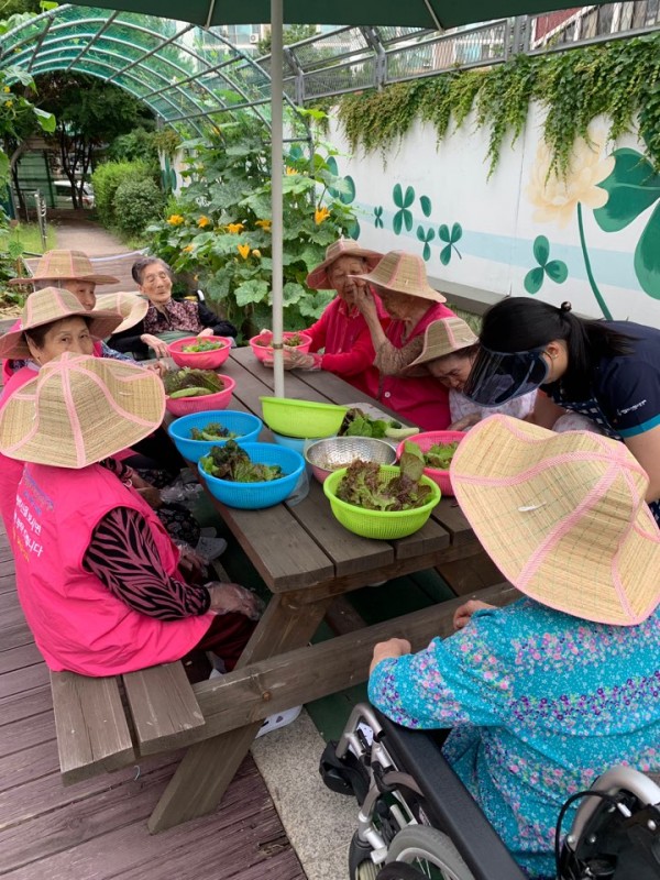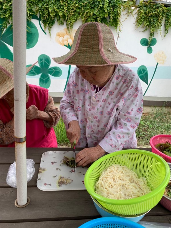 - 어르신들과 같이 상추와 오이를 수확해서 야채비빔국수를 만들어 먹는 시간을 가졌습니다. 어르신들은 매운것을 좋아하지 않으셔서 간장베이스로 하여 직접 수확한 상추와 오이를 썰어 넣어준뒤 조물조물 어르신들이 직접 비벼주셨습니다.