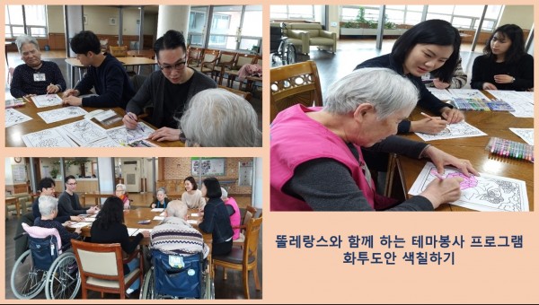 [복지]똘레랑스와 함께하는 재미있는 테마 봉사 페이지 정보 작성자 송유라 작성일2019-03-27 18:10 조회3,276회 댓글0건 관련링크 이전글 다음글 목록 본문 안녕하세요^^3월 23일에 진행된 똘레랑스(자원봉사자 단체) 멤버분들이 동부를 방문해주셨습니다^ㅡ^동부어르신들과 재미나는 화투 도안 색칠하기를 진행하였습니다!!다양한 테마봉사활동을 통하여 입소어르신들의 재미,활력을 느끼시길 바랍니다^^ 감사합니다! 댓글목록 등록된 댓글이 없습니다. 이전글 다음글 목록